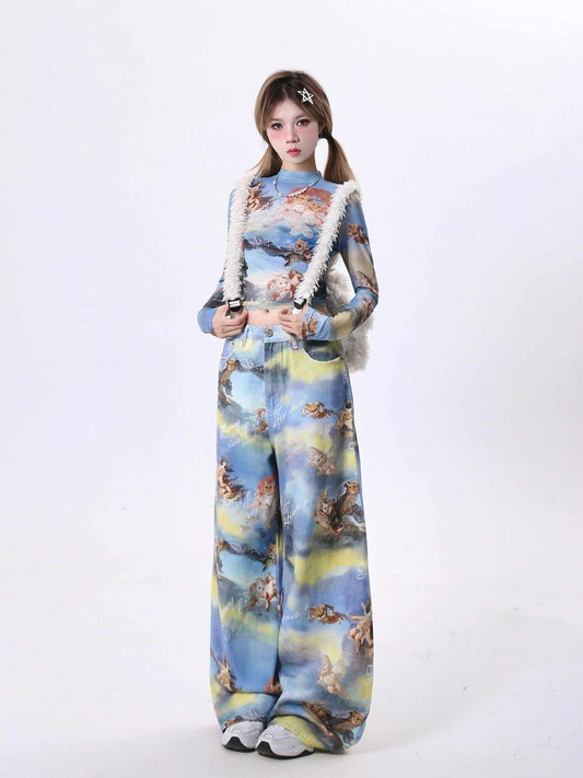Casual Angel Kitten Oil Painting Printing Wide Leg Pants