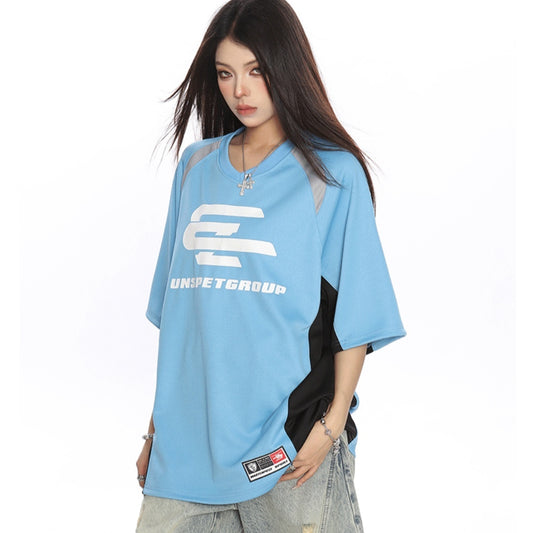 Female Color Blocked Patchwork Small V-neck Raglan Short Sleeved Shirt